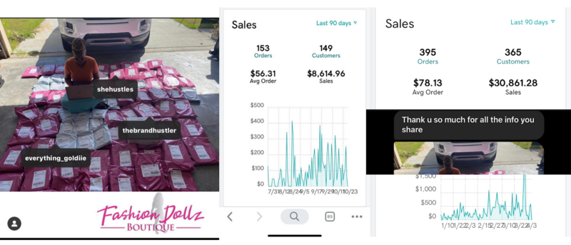 With her new visuals and strategies, she relaunched her business. Since she has gone from $500 to $3,000 to $10,000 per month. She now averages $30K per month, owns a storefront in the mall, has won entrepreneurial awards, and has been featured in New York Times Square.
